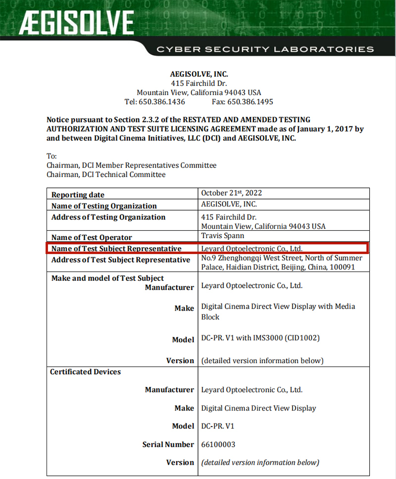 眾所周知,DCI是目前國際通用的數(shù)字影院系統(tǒng)認證標準。受該規(guī)范限制,未獲得DCI認證的數(shù)字電影系統(tǒng)或產(chǎn)品無法在電影市場上進行應用推廣。2022年10月,利亞德?lián)碛型耆灾髦R產(chǎn)權的LED電影屏獲得好萊塢DCI認證?;诖?,利亞德布局影院市場的腳步,再進一步。而通過中國國家強制性產(chǎn)品認證、中央宣傳部電影技術質量檢測,則意味著利亞德將在國內數(shù)字影院市場開啟新的篇章。