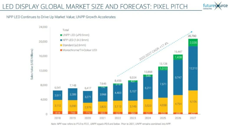 2022年,全球LED顯示行業(yè)展現(xiàn)出持續(xù)增長的強(qiáng)勁勢頭。Futuresource報告顯示,2022年全球LED顯示市場達(dá)到85億美元,與2021年相比增長了10.6%。Futuresource預(yù)計2023年全球LED市場的收入將增長10.2%,達(dá)到93億美元。五年預(yù)測顯示,到2027年,復(fù)合年增長率(CAGR)將達(dá)到17.4%,市場規(guī)模將增至208億美元。利亞德作為國家制造業(yè)單項冠軍,對顯示行業(yè)未來發(fā)展充滿信心。