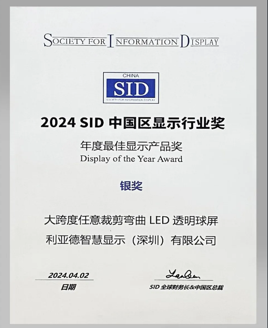 SID大獎,作為全球顯示技術(shù)領(lǐng)域的權(quán)威獎項,匯聚了全球頂尖的設(shè)計理念和技術(shù)成果。每一屆的評選都代表著行業(yè)內(nèi)的最高水準(zhǔn),獲獎產(chǎn)品不僅展示了技術(shù)的前沿性,更是藝術(shù)與科技完美結(jié)合的典范。銀獎的獲得,無疑是利亞德在LED顯示技術(shù)領(lǐng)域的一次里程碑式飛躍,標(biāo)志著我們在透明顯示技術(shù)上的突破已得到國際同行的廣泛認同。
